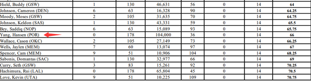 杨瀚森的加权得分是66(分越低排名越高,比如约基奇是1.75),在他后一位是雷霆的卡森-华莱士,在他前一位是鹈鹕的萨迪克-贝。