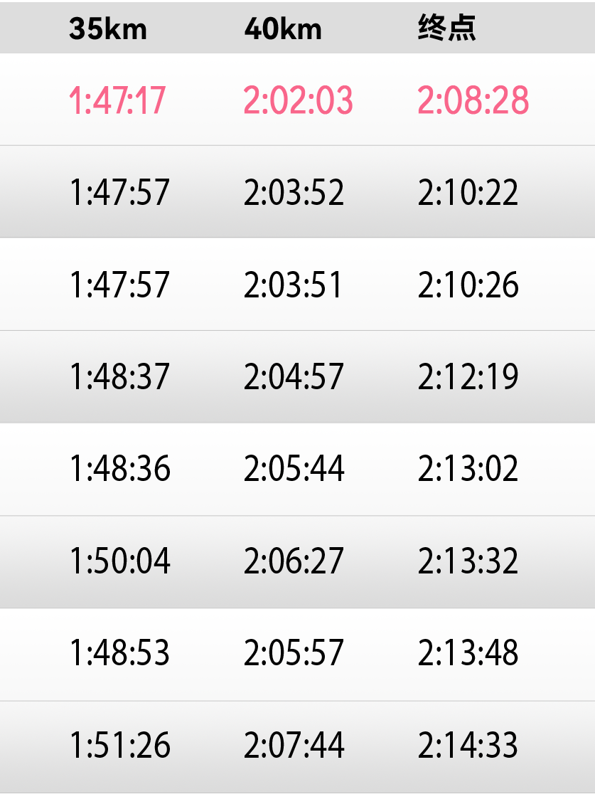 35公里至40公里区间,朱卿完成了关键的反超。尽管赛后朱卿谦虚地表示自己“30公里加速加早了,35.5公里崩掉了,后面是顶回来的”,但她依然展现了极强的后程能力,最终以2:28:53夺得国内女子冠军,不仅大幅刷新个人PB,更以非注册选手的身份跑出如此成绩,强势重夺“大众一姐”称号。刘敏则以2:29:23的成绩获得国内亚军。