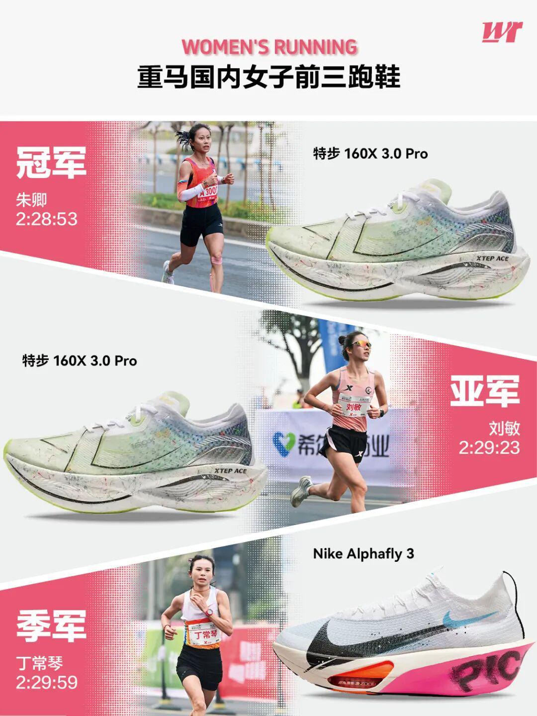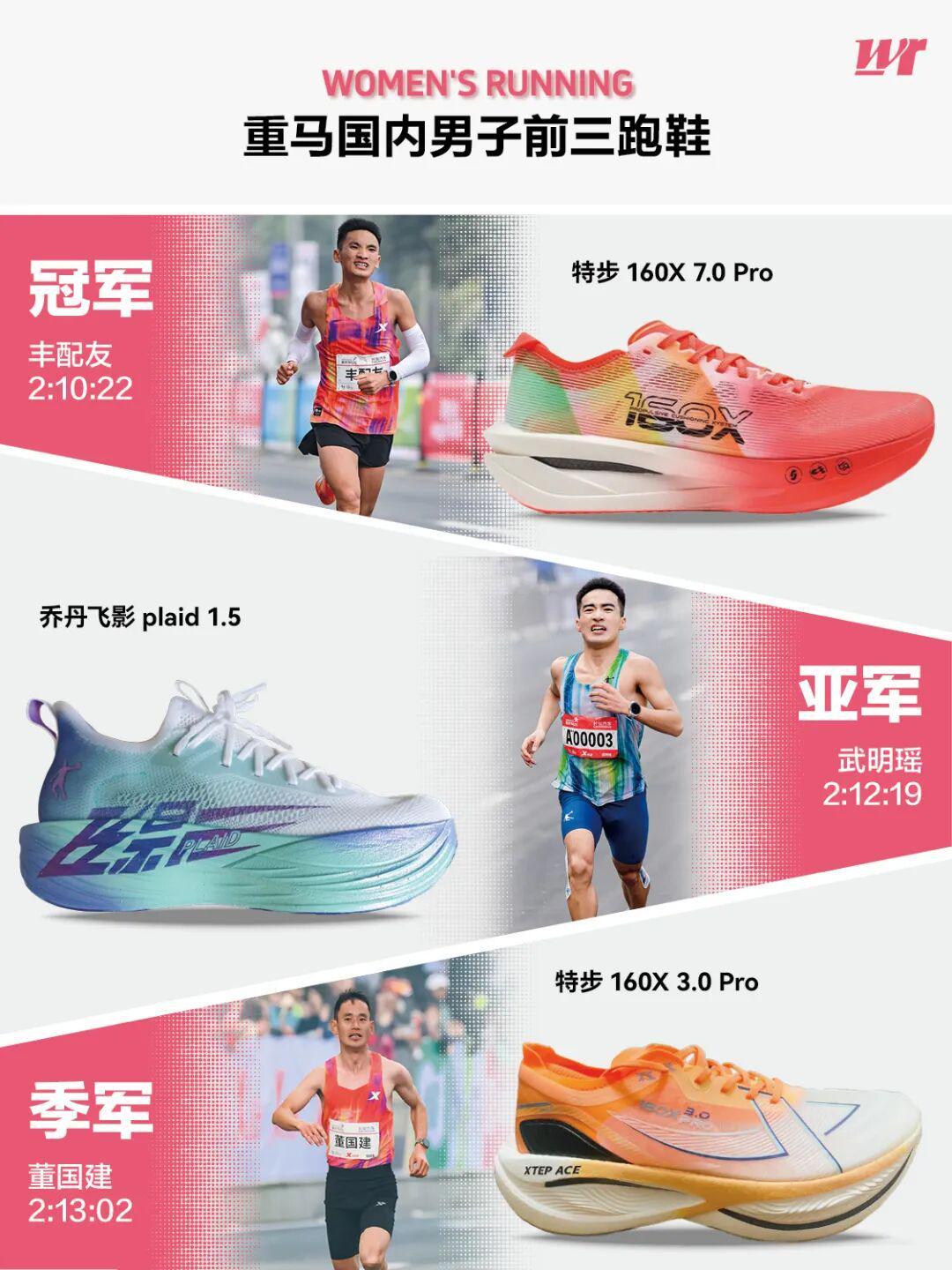 作为主赞助商的特步邀请了非常具有实力的签约运动员。丰配友、董国建、刘敏三人都是全运会主力选手,朱卿和黄菲也是特步签约运动员中顶级的大众运动员,还有张水华辞职后的首场全马也穿上了特步的跑鞋。最终男女国内前三中,特步占据国内女子冠亚军和国内男子冠军和季军4席,耐克运动员丁常琴获国内女子第三,穿着乔丹的武明瑶获国内男子第二。
